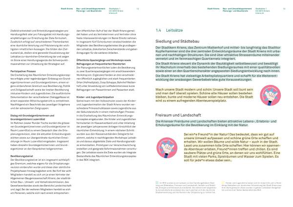 Im Räumlichen Entwicklungskonzept (REK) sind die Inputs der Kinder- und Jugendpartizipation als integraler Bestandteil in Form von Leitsätzen enthalten. Diese Leitsätze werden im REK abgebildet und den in den Handlungsfeldern «Siedlung und Städtebau», «Freiraum und Landschaft» sowie «Verkehr und Mobilität» bearbeiteten Entwicklungskonzepten vorangestellt und inhaltlich zugrundegelegt.