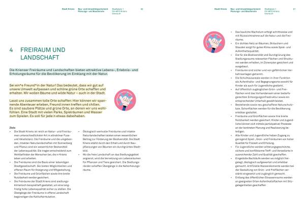Eine wichtige Forderung der Kinder und Jugendlichen für die Räumliche Entwicklung der Stadt Kriens ist die Schaffung zusätzlicher Natur- und Grünräume. Das so wollen die Kinder und Jugendlichen mehr Bäume und Natur in der Stadt und einen visuell ansprechenden, vielfarbigen und bunten Stadtraum.
